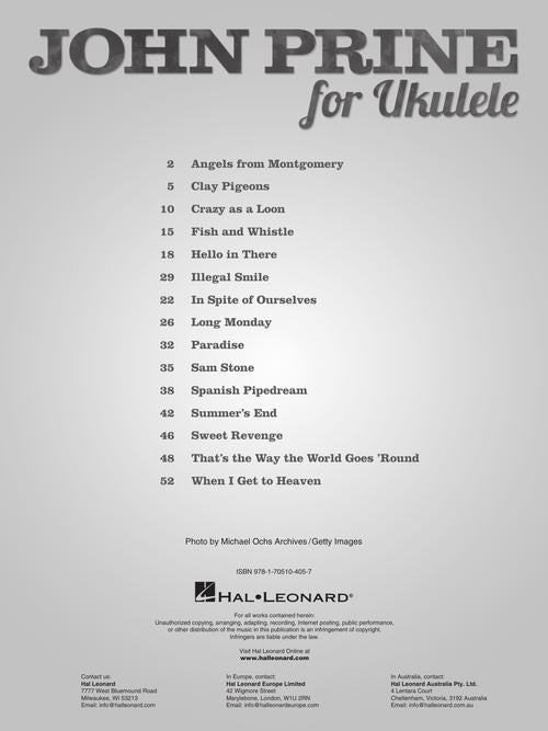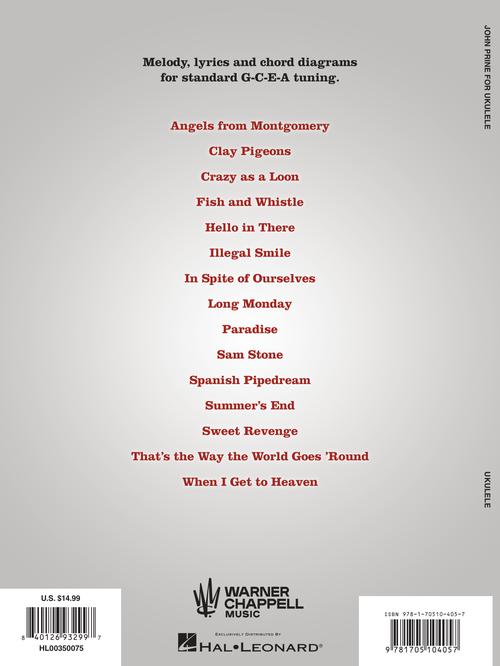 Artist: John Prine John Prine for Ukulele Publisher: Hal Leonard Category: Guitar, Bass & Fretted Series: Ukulele Format: Softcover 15 of the best from the late country/folk singer-songwriter in standard G-C-E-A arrangements for ukulele. Includes: Angel...Regular price $17.99 -