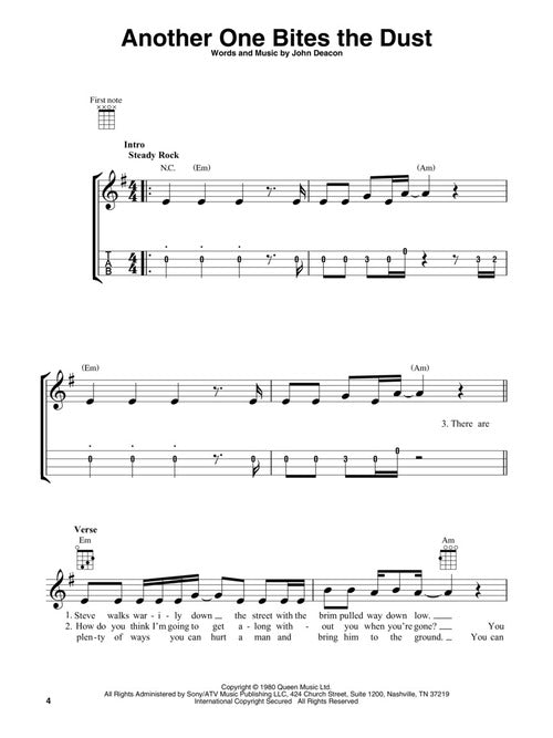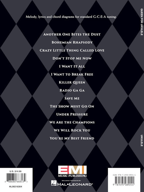 Artist: QueenQueen for UkuleleSoftcover14 hits from Freddie Mercury and crew for uke, in standard G-C-E-A tuning with melody, lyrics and chord diagrams. Includes: Another One Bites the Dust · Bohemian Rhapsody · Crazy Little Thing Called...Regular price $19.99 -