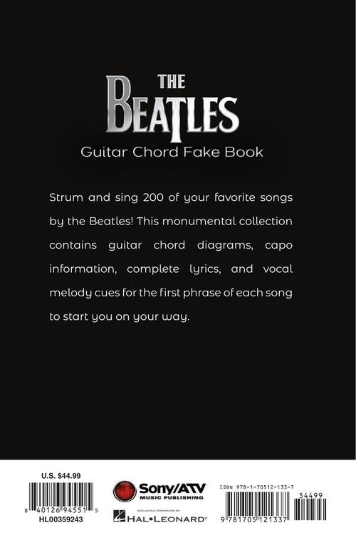 The Beatles Guitar Chord Fake BookPublisher: Hal LeonardCategory: Guitar, Bass & FrettedSeries: Guitar Chord SongbookFormat: SoftcoverStrum and sing 2 of your favorite songs by the Beatles! This monumental collection contains guitar chord diagrams, capo information, complete...Regular price $53.99 -