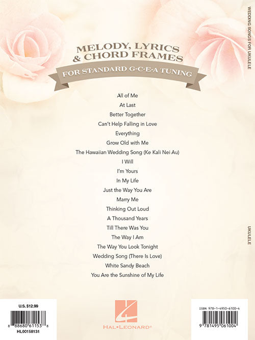 Composer: Various Wedding Songs for Ukulele 20 Favorites to Strum & Sing Softcover Twenty songs perfect for wedding ceremonies in arrangements for ukuleles with standard G-C-E-A tuning featuring melody, lyrics and chord frames for each song....Regular price $15.99 -