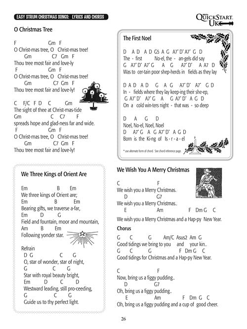 Ukulele Christmas Songs Kev's QuickStart Publisher: Centerstream Publications Category: Guitar, Bass & Fretted Series: Fretted Format: Softcover 12 popular Christmas songs are presented in this collection, arranged by Kevin Rones for easy fingerstyle ukulele. Songs include:...Regular price $11.99 -