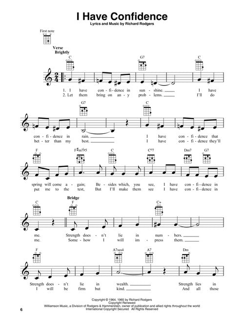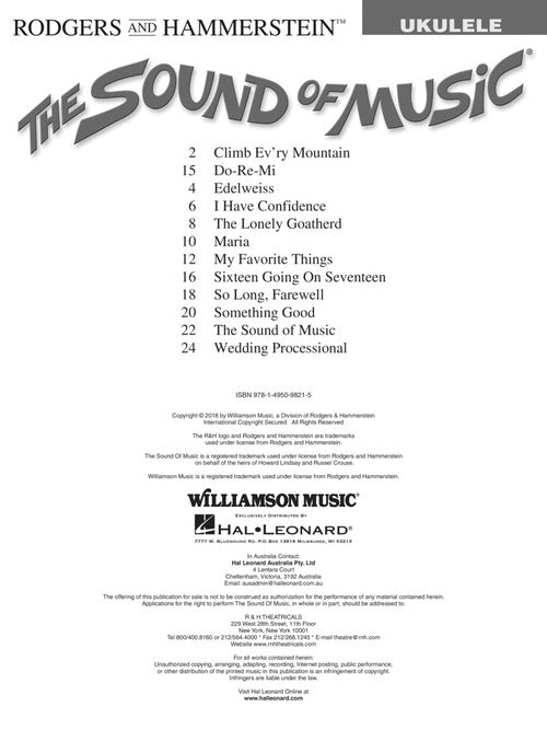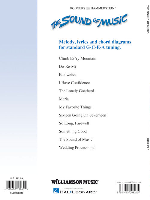 Composer: Oscar Hammerstein II The Sound of Music for Ukulele Publisher: Hal Leonard Category: Guitar, Bass & Fretted Series: Ukulele Format: Softcover A dozen songs from the ever-popular Rodgers & Hammerstein musical presented in melody, lyrics...Regular price $15.99 -