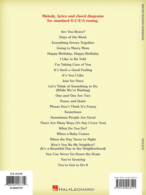 Artist: Fred Rogers The Mister Rogers Songbook for Ukulele Publisher: Hal Leonard Category: Guitar, Bass & Fretted Series: Ukulele Format: Softcover It's a beautiful day in the neighborhood when you're strumming the ukulele! This collection features...Regular price $17.99