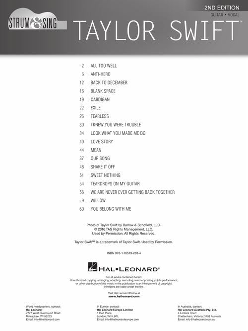 Strum & Sing Taylor Swift - 2nd Edition Publisher: Hal Leonard Category: Guitar, Bass & Fretted Series: Strum & Sing Guitar Format: Softcover This great collection will have you strumming and singing your favorite Taylor songs...Regular price $23.99 -