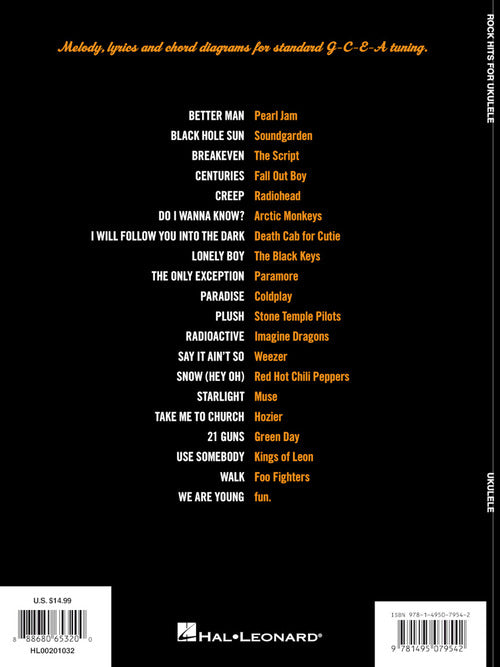 Artist: Various Rock Hits for Ukulele Softcover A hot collection of 20 hits arranged with melody, lyrics and chord diagrams for standard G-C-E-A tuning. Includes: Better Man · Black Hole Sun · Breakeven · Creep ·...Regular price $17.99