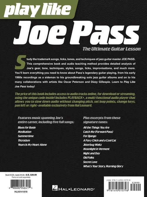 Artist: Joe Pass Play Like Joe Pass: The Ultimate Guitar Lesson Book with Online Audio The Ultimate Guitar Lesson Softcover Audio Online Study the trademark songs, licks, tones, and techniques of jazz guitar master Joe Pass....Regular price $35.99 -