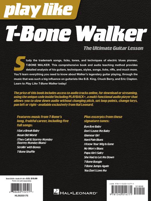 Artist: T-Bone Walker Play like T-Bone Walker The Ultimate Guitar Lesson with Audio Access Included! Publisher: Hal Leonard Category: Guitar, Bass & Fretted Series: Play Like Format: Softcover Audio Online Guitar Tab: YES Study the trademark...Regular price $23.99 -