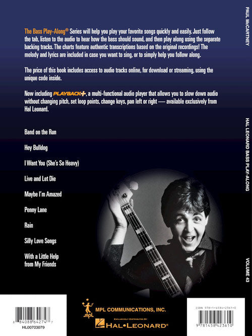 Paul McCartney Bass Play-Along Volume 43 Publisher: Hal Leonard Category: Guitar, Bass & Fretted Series: Bass Play-Along Format: Softcover Audio Online Guitar Tab: YES The Bass Play-Along Series will help you play your favorite songs quickly...Regular price $23.99
