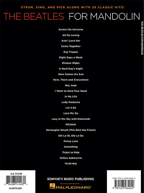 Artist: The Beatles The Beatles for Mandolin Publisher: Hal Leonard Category: Guitar, Bass & Fretted Series: Mandolin Format: Softcover Guitar Tab: YES Strum, sing and pick along with these 25 Beatles favorites arranged for mandolin! Includes:...Regular price $29.99 -