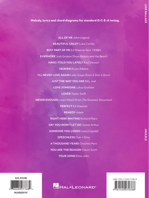 Composer: Various Love Ballads 20 Favorites to Strum and Sing on Ukulele Publisher: Hal Leonard Category: Guitar, Bass & Fretted Series: Ukulele Format: Softcover 20 romantic favorites presented with melody, lyrics and chord diagrams for standard...Regular price $17.99 -