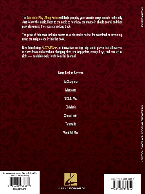 Italian Classics Mandolin Play-Along Volume 7 Publisher: Hal Leonard Category: Guitar, Bass & Fretted Series: Mandolin Play-Along Format: Softcover Audio Online The Mandolin Play-Along Series will help you play your favorite songs quickly and easily. Just...Regular price $20.99 -
