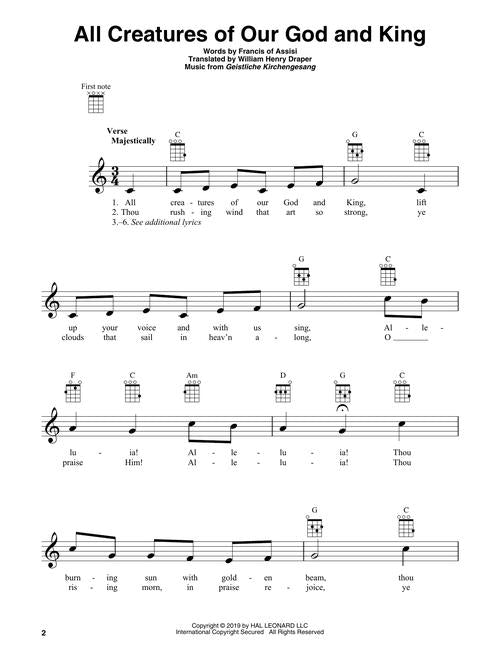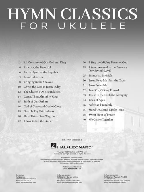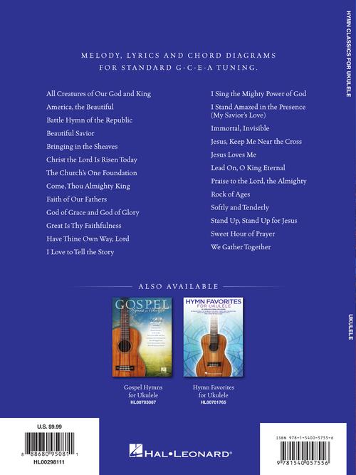 Composer: Various Hymn Classics for Ukulele Publisher: Hal Leonard Category: Guitar, Bass & Fretted Series: Ukulele Format: Softcover 25 songs of faith arranged for ukulele with melody, lyrics and chord diagrams for standard G-C-E-A tuning. Includes:...Regular price $11.99 -