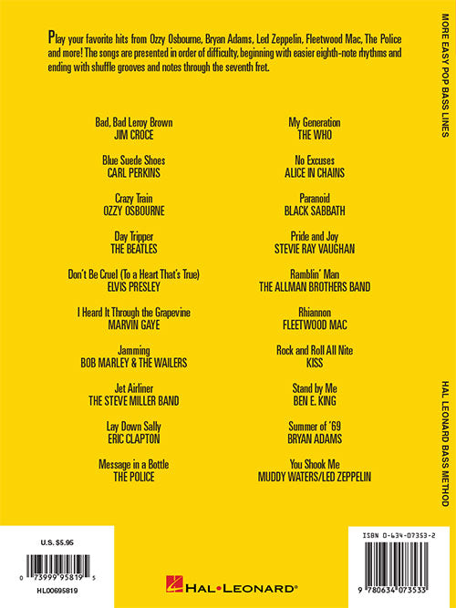 Artist: Various More Easy Pop Bass Lines Supplemental Songbook to Book 2 of the Hal Leonard Bass Method Publisher: Hal Leonard Category: Guitar, Bass & Fretted Series: Bass Method Format: Paperback This songbook correlates with Book...Regular price $17.99 -