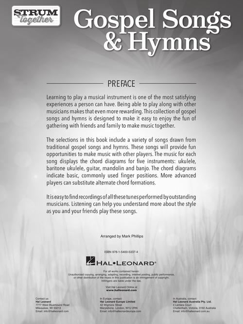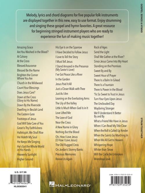 Gospel Songs & Hymns - Strum Together Publisher: Hal Leonard Category: Guitar, Bass & Fretted Series: Strum Together Format: Softcover The Strum Together series enables players of five different instruments - or any combination of them...Regular price $21.99 -