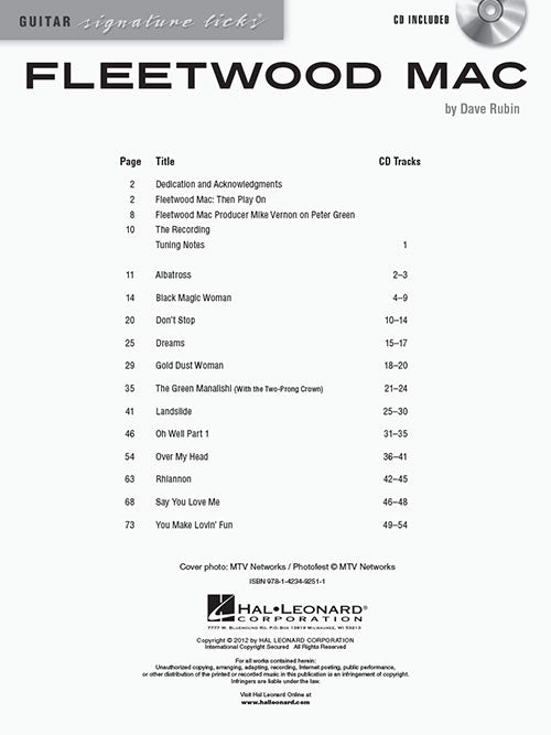 Artist: Fleetwood Mac Fleetwood Mac A Step-by-Step Breakdown of the Guitar Styles and Techniques of Lindsey Buckingham and Peter Green Publisher: Hal Leonard Category: Guitar, Bass & Fretted Series: Signature Licks Guitar Format: Softcover with CD...Regular price $27.99 -