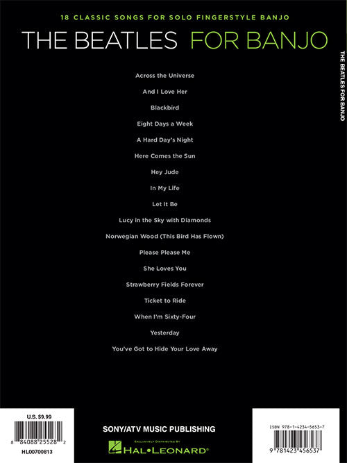 Artist: The Beatles The Beatles for Banjo Publisher: Hal Leonard Category: Guitar, Bass & Fretted Series: Banjo Format: Softcover Guitar Tab: YES 18 of the Fab Four's finest for five string banjo! Includes: Across the Universe...Regular price $23.99 -