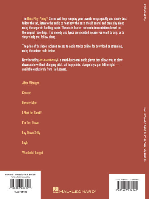 Eric Clapton Bass Play-Along Volume 29 Publisher: Hal Leonard Category: Guitar, Bass & Fretted Series: Bass Play-Along Format: Softcover Audio Online Guitar Tab: YES The Bass Play-Along series will help you play your favorite songs quickly...Regular price $21.99 -