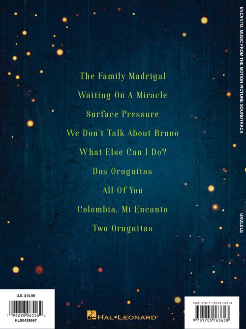 Encanto Music from the Motion Picture Soundtrack Publisher: Hal Leonard Category: Guitar, Bass & Fretted Series: Ukulele Format: Softcover This folio includes nine songs from Disney's latest blockbuster Encanto, featuring an infectious soundtrack by Lin-Manuel Miranda,...Regular price $17.99 -