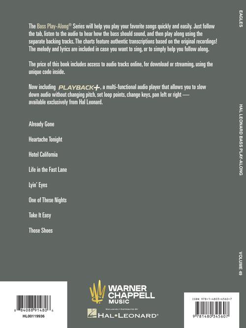 Eagles Bass Play-Along Volume 49 Publisher: Hal Leonard Category: Guitar, Bass & Fretted Series: Bass Play-Along Format: Softcover Audio Online The Bass Play-Along Series will help you play your favorite songs quickly and easily! Just follow...Regular price $29.99 -