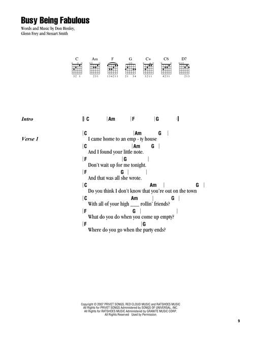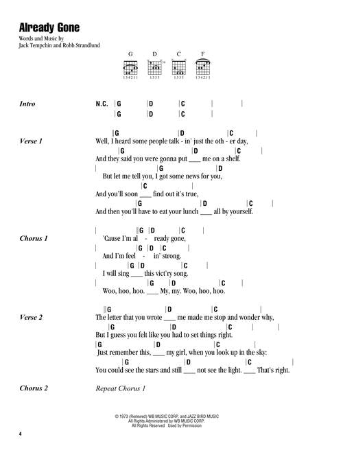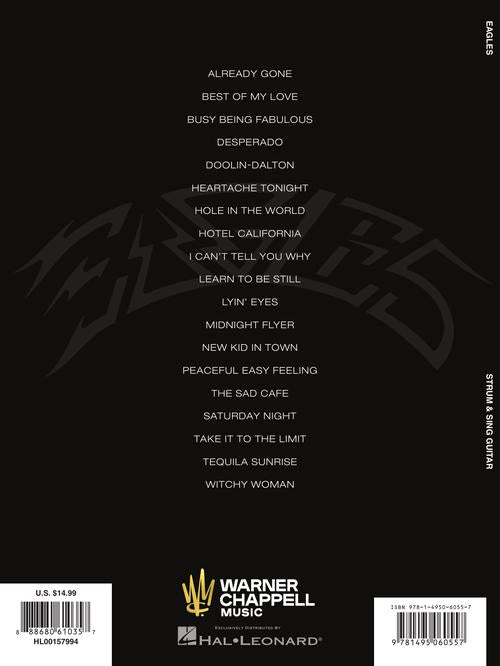 Artist: Eagles Eagles - Strum & Sing Guitar Softcover This series provides an unplugged and pared-down approach to your favorite songs - just the chords and the lyrics, nothing fancy. Here are 19 Eagles favorites: Already...Regular price $17.99