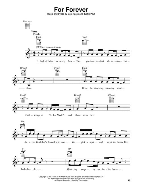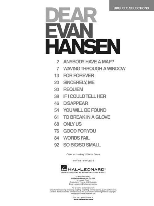 Composer: Benj Pasek Dear Evan Hansen Ukulele Selections Publisher: Hal Leonard Category: Guitar, Bass & Fretted Series: Ukulele Format: Softcover 13 ukulele selections in standard G-C-E-A tuning with melody, lyrics and chord diagrams from the Broadway...Regular price $17.99 -