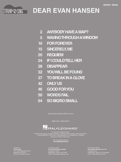Composer: Benj Pasek Dear Evan Hansen Strum & Sing Guitar Publisher: Hal Leonard Category: Guitar, Bass & Fretted Series: Strum & Sing Guitar Format: Softcover Dear Evan Hansen: unplugged and pared-down to get to the essence...Regular price $20.99 -