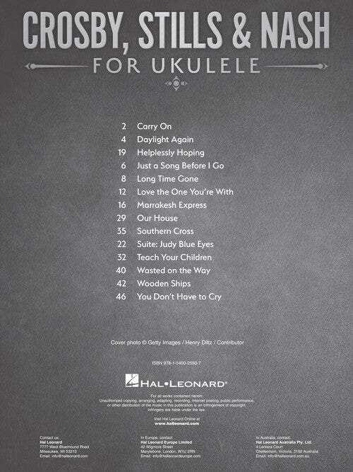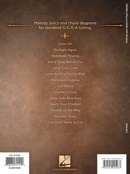 Artist: Crosby, Stills & Nash Crosby, Stills & Nash for Ukulele Publisher: Hal Leonard Category: Guitar, Bass & Fretted Series: Ukulele Format: Softcover 14 folk favorites from CSN arranged for ukulele, presented with melody, lyrics and...Regular price $17.99 -