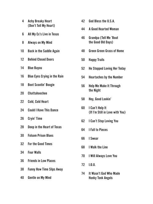 Artist: Various Country Hits - Guitar Chord Songbook Softcover 40 well-known country classics arranged with guitar chords and lyrics, including: As Good As I Once Was · Before He Cheats · Cruise · Don't You Wanna...Regular price $17.99