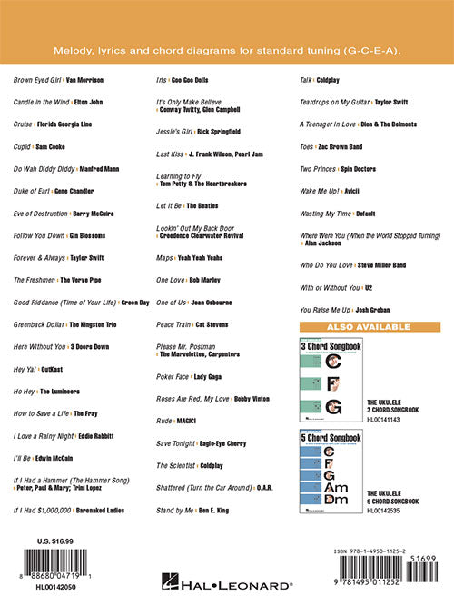 The Ukulele 4 Chord SongbookPublisher: Hal LeonardCategory: Guitar, Bass & FrettedSeries: UkuleleFormat: SoftcoverWith just 4 chords, you can play 50 hot songs on your ukulele! Songs include: Brown Eyed Girl · Do Wah Diddy Diddy ·...Regular price $21.99 -