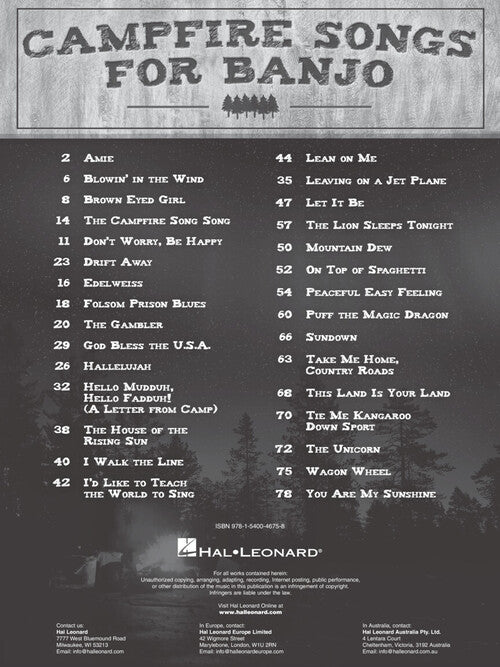 Composer: Various Campfire Songs for Banjo Strum & Sing with Family & Friends Publisher: Hal Leonard Category: Guitar, Bass & Fretted Series: Banjo Format: Softcover 30 essential fireside favorites arranged for banjo, including: Brown Eyed Girl...Regular price $17.99 -