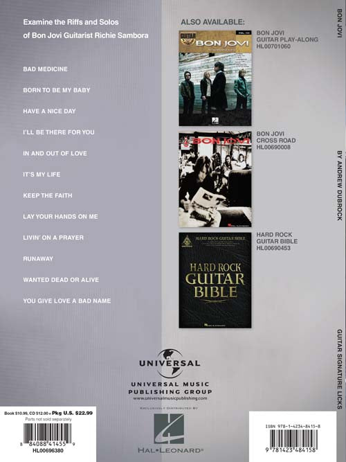 Artist: Bon Jovi Bon Jovi A Step-by-Step Breakdown of the Guitar Styles and Techniques of Richie Sambora Publisher: Hal Leonard Category: Guitar, Bass & Fretted Series: Signature Licks Guitar Format: Softcover with CD Guitar Tab: YES...Regular price $27.99