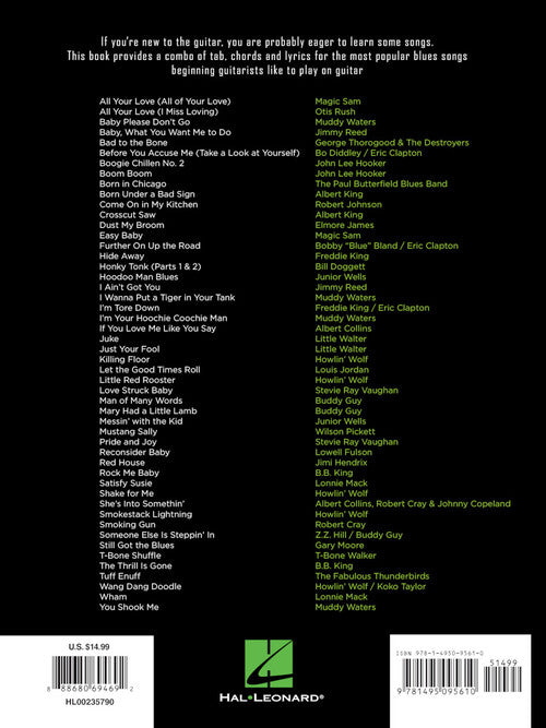 Artist: VariousFirst 50 Blues Songs You Should Play on GuitarPublisher: Hal LeonardCategory: Guitar, Bass & FrettedSeries: Guitar CollectionFormat: SoftcoverGuitar Tab: YESIf you're looking to expand your guitar chops into the blues, this is the collection for...Regular price $21.99 -