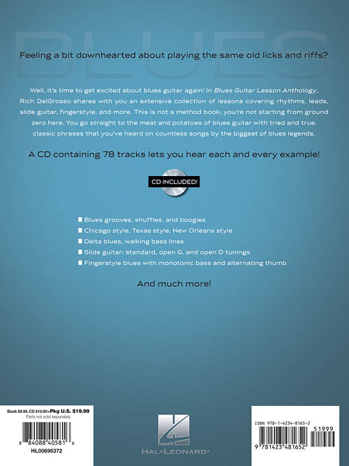 Author: Rich DelGrosso Blues Guitar Lesson Anthology A Guide to Playing Genuine Houserockin' Music Publisher: Hal Leonard Category: Guitar, Bass & Fretted Series: Guitar Educational Format: Softcover with CD Guitar Tab: YES Time to get excited...Regular price $23.99 -
