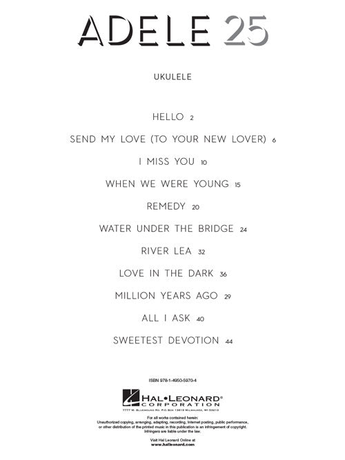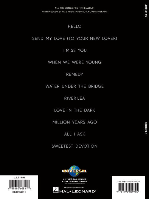 Artist: Adele Adele - 25 Ukulele Softcover All 11 songs from the Adele's triumphant return to the charts with this 2015 album. Our songbook features ukulele arrangements with chord frames for: All I Ask · Hello...Regular price $17.99