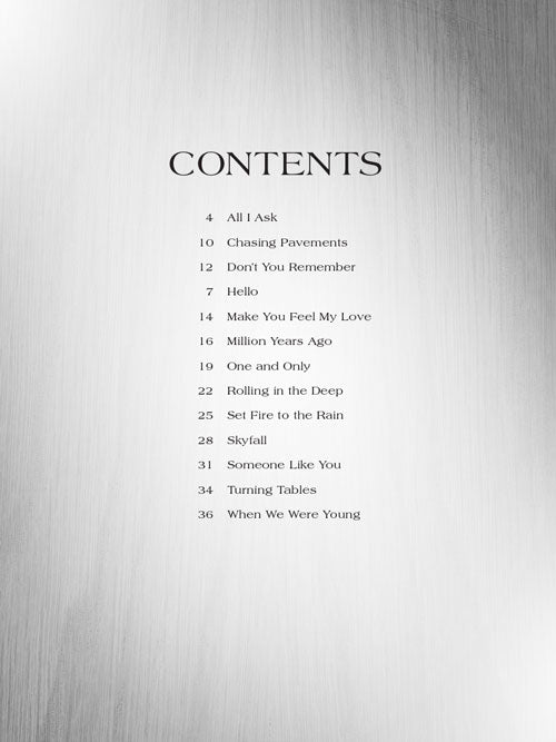 Artist: Adele Adele - Strum & Sing Guitar Softcover 13 Adele classics, unplugged and pared down! Features easy-to-play arrangements with chords and lyrics for: All I Ask · Chasing Pavements · Don't You Remember · Hello...Regular price $15.99 -
