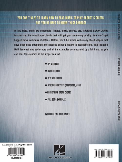 Author: Chad Johnson Acoustic Guitar Chords Learn the Essential Chords You Need to Start Playing Acoustic Guitar Now! Publisher: Hal Leonard Category: Guitar, Bass & Fretted Series: Guitar Educational Format: Softcover with DVD In any music...Regular price $15.99