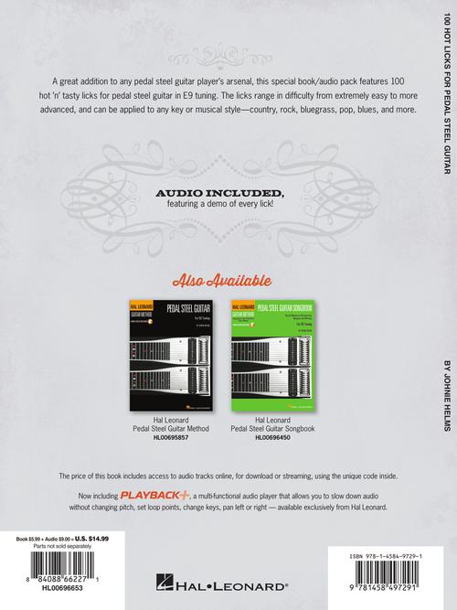 Author: Johnie Helms 100 Hot Licks for Pedal Steel Guitar Essential Soloing Phrases for E9 Tuning Publisher: Hal Leonard Category: Guitar, Bass & Fretted Series: Pedal Steel Guitar Format: Softcover Audio Online Guitar Tab: YES A...Regular price $21.99 -