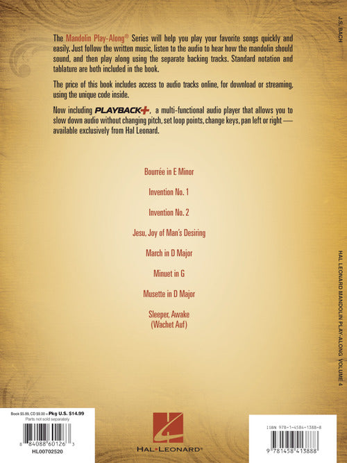 J.S. Bach Mandolin Play-Along Volume 4 Publisher: Hal Leonard Category: Guitar, Bass & Fretted Series: Mandolin Play-Along Format: Softcover Audio Online The Mandolin Play-Along Series will help you play your favorite songs quickly and easily. Just...Regular price $20.99 -
