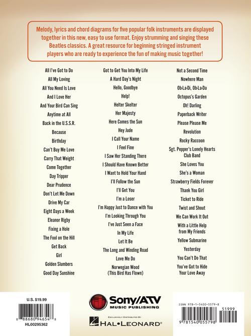 Artist: The Beatles The Beatles - Strum Together for Ukulele, Baritone Ukulele, Guitar, Mandolin, Banjo Publisher: Hal Leonard Category: Guitar, Bass & Fretted Series: Strum Together Format: Softcover 70 songs with lyrics, melody lines, and chord...Regular price $31.99 -