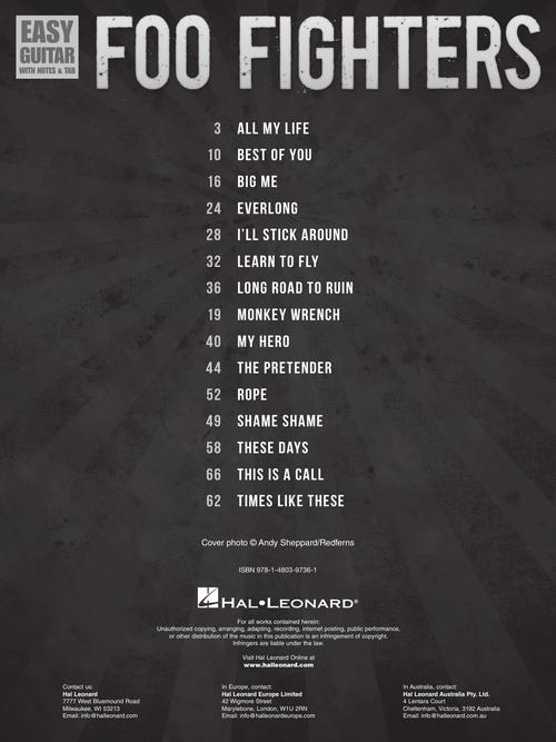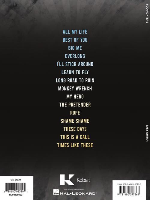 Foo Fighters - Easy Guitar with TabPublisher: Hal LeonardCategory: Guitar, Bass & FrettedSeries: Easy GuitarFormat: SoftcoverGuitar Tab: YES15 easier guitar arrangements with lyrics of Foo Fighters favorites: All My Life · Best of You · Big...Regular price $21.99 -