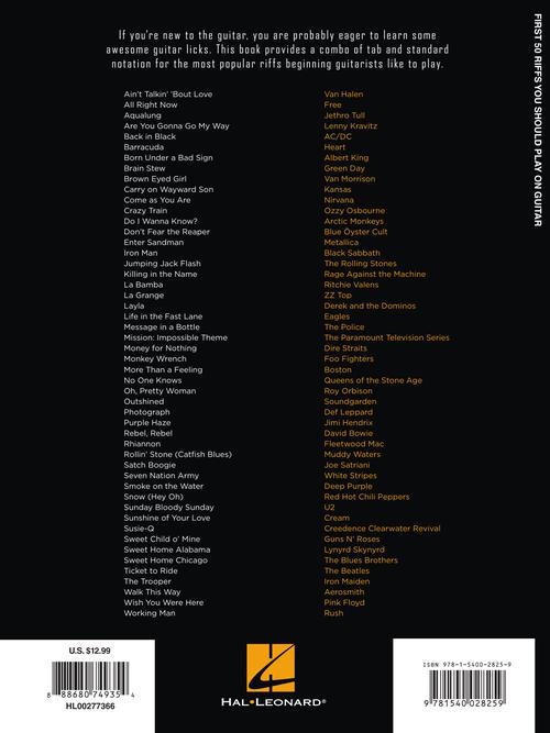 Artist: VariousFirst 50 Riffs You Should Play on GuitarPublisher: Hal LeonardCategory: Guitar, Bass & FrettedSeries: Guitar CollectionFormat: SoftcoverGuitar Tab: YESNow that you've had a few lessons you're ready to start learning all the riffs that made...Regular price $21.99 -