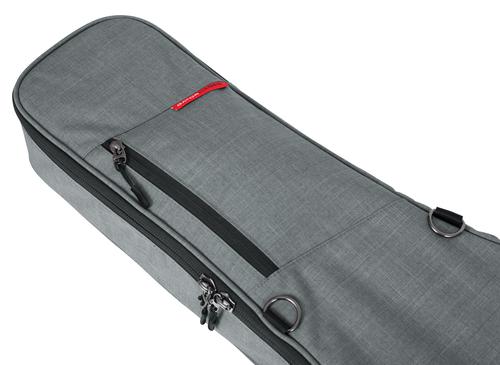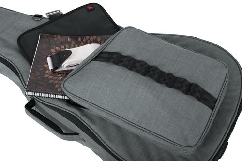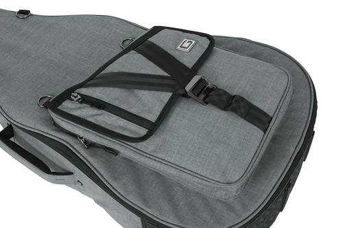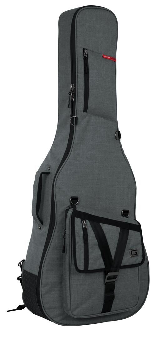 Transit Series Gig Bag designed to fit acoustic guitars! · Weather resistant blended fabric exterior · Thick rubber tread on bottom of the bag prevents wear and protects from small puddles to spilled drinks · 2mm thick foam padding covered with plush micro-fleece lining · Rigid interior construction within the frame of the bag for case-like protection · Adjustable, removable three-point interior padding system protects the headstock, neck and bottom/endpin · Large front zippered pocket with flap, features G-hook buckle and seatbelt loops for multiple connection points allowing you to fill the pocket to capacity and still secure it · Small pocket on front flap with soft lining for electronics provides quick access to phone, keys and small electronics · Molded, padded, contoured handle for a secure yet comfortable grip · Padded hideaway straps several D-rings for clipping accessories