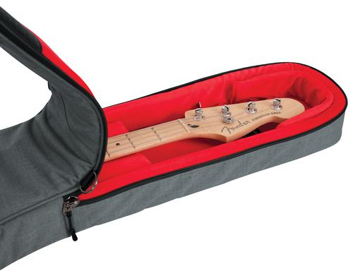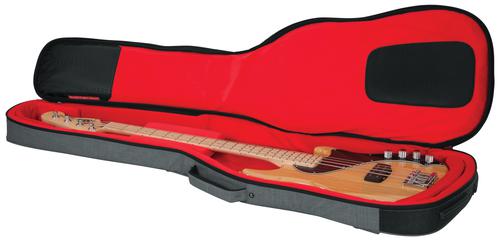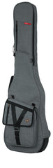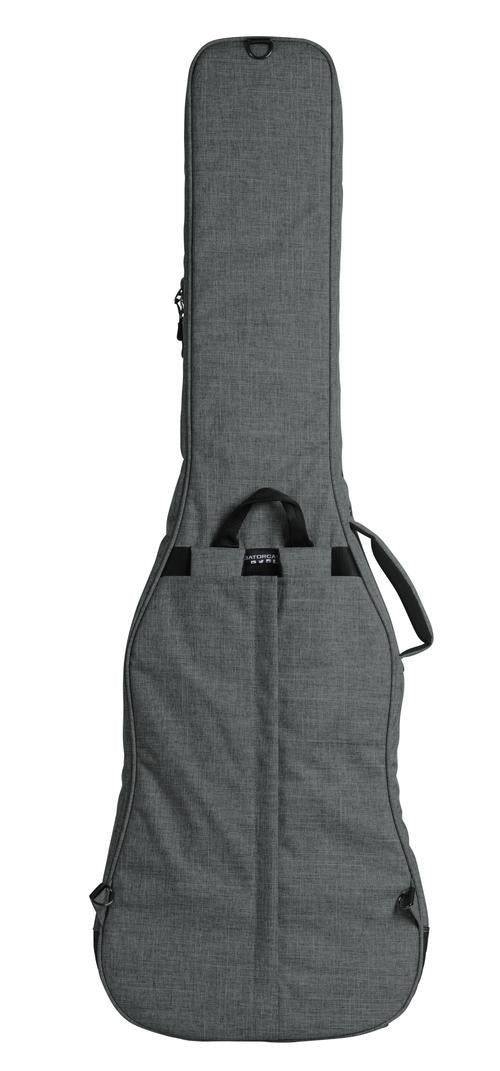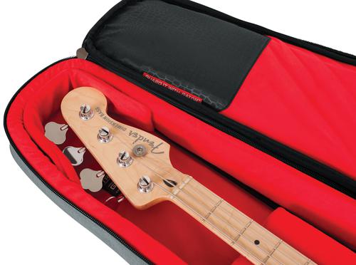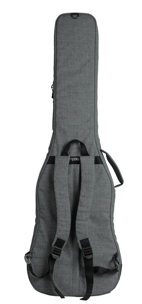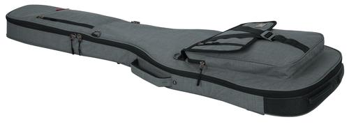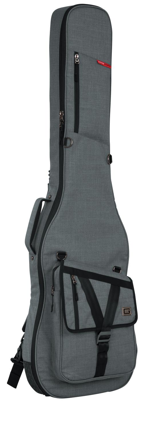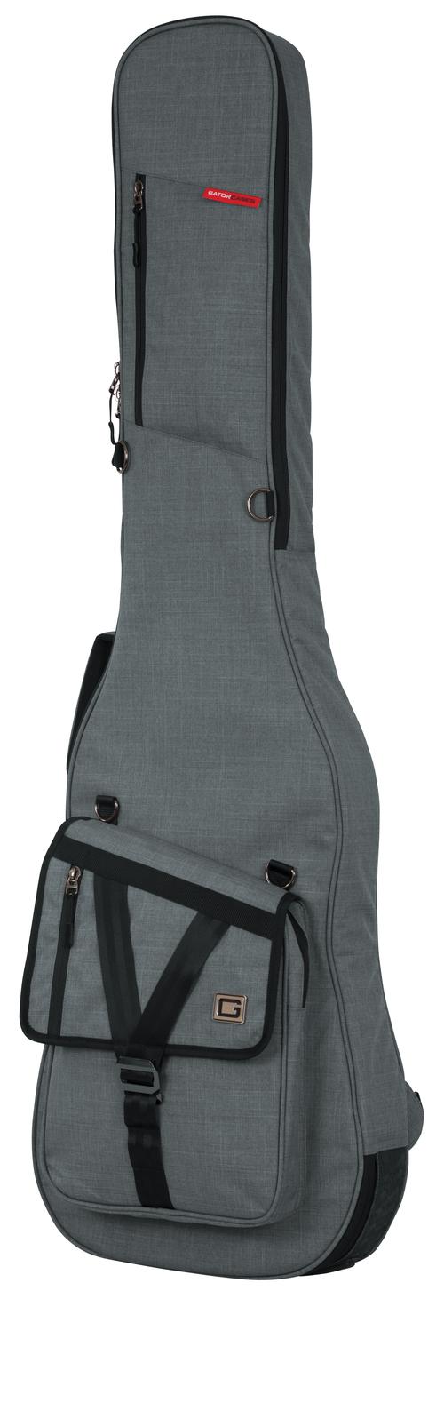 Transit series gig bag designed to fit bass guitars. Features: · Weather-resistant blended fabric exterior in light grey · Thick rubber tread on bottom of the bag prevents wear and protects from small puddles to spilled drinks · 2mm thick foam padding covered with plush micro-fleece lining · Rigid interior construction within the fram of the bage for case-like protection · Adjustable, removable three-point interior padding system protects the headstock, neck and bottom/endpin · Large front zippered pocket with flap · Features g-hook buckle and seatbelt loops for multiple connection points allowing you to fill the pocket to capacity and still secure it · Small pocket on front flap with soft lining for electronics · Molded, padded, contoured handle for a secure yet comfortable grip · Padded hideaway straps · Several d-rings for clipping accessories