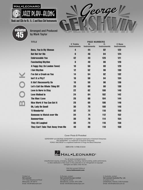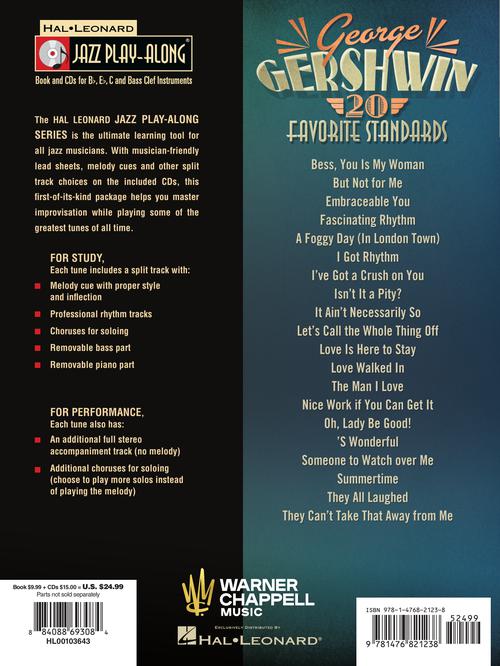 For use with all Bb, Eb, C and bass clef instruments, the Jazz Play-Along Series is the ultimate learning tool for all jazz musicians. With musician-friendly lead sheets, melody cues and other split-track choices on the included audio, this first-of-its-kind package helps you master improvisation while playing some of the greatest tunes of all time. FOR STUDY, each tune includes a split track with: · Melody cue with proper style and inflection · Professional rhythm tracks · Choruses for soloing · Removable bass part · Removable piano part. FOR PERFORMANCE, each tune also has: · An additional full stereo accompaniment track (no melody) · Additional choruses for soloing. This supersized collection includes 20 Gershwin standards, including: Bess, You Is My Woman · Fascinating Rhythm · A Foggy Day (In London Town) · I Got Rhythm · Let's Call the Whole Thing Off · Love Walked In · Nice Work If You Can Get It · Oh, Lady Be Good! · 'S Wonderful · Someone to Watch over Me · Summertime · They All Laughed · They Can't Take That Away from Me · and more. Audio is accessed online using the unique code inside the book and can be streamed or downloaded. The audio files include PLAYBACK+, a multi-functional audio player that allows you to slow down audio without changing pitch, set loop points, change keys, and pan left or right.