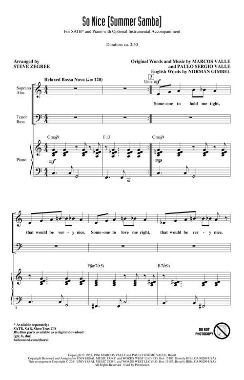 The smooth sounds of sixties bossa nova shimmer in this warm setting of the classic song that maintains its popularity even today. Great for developing style and blend! Available separately: SATB, SAB, ShowTrax CD. Rhythm parts available digitally (gtr, b, dm). Duration: ca. 2:50.