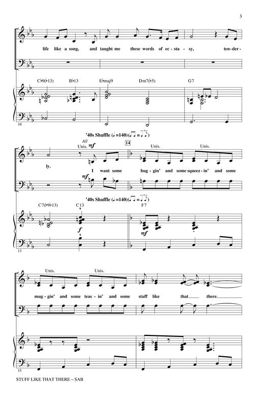 Stuff Like That There Composer: Jay Livingston arr. Kirby Shaw Publisher: Category: Choral Series: Jazz Chorals Format: Voicing: SAB Your audiences will love this vampy '40s big band tune, originally recorded by Betty Hutton and covered...Regular price $22.99 -