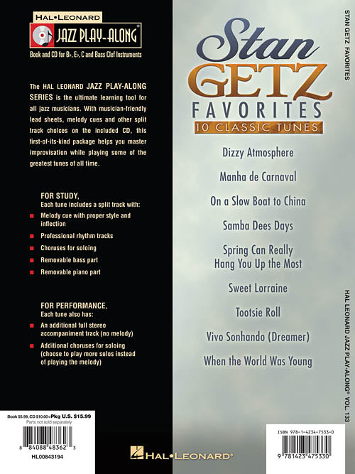 Artist: Stan Getz Stan Getz - Favorites Jazz Play-Along Volume 133 Publisher: Hal Leonard Category: Solo Instrumental Series: Jazz Play Along Format: Softcover with CD For use with all B-flat, E-flat, Bass Clef and C instruments,...Regular price $20.99 -