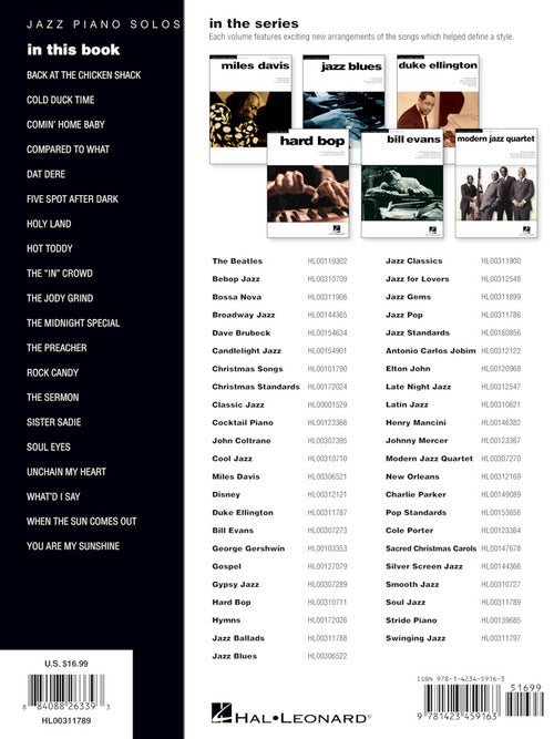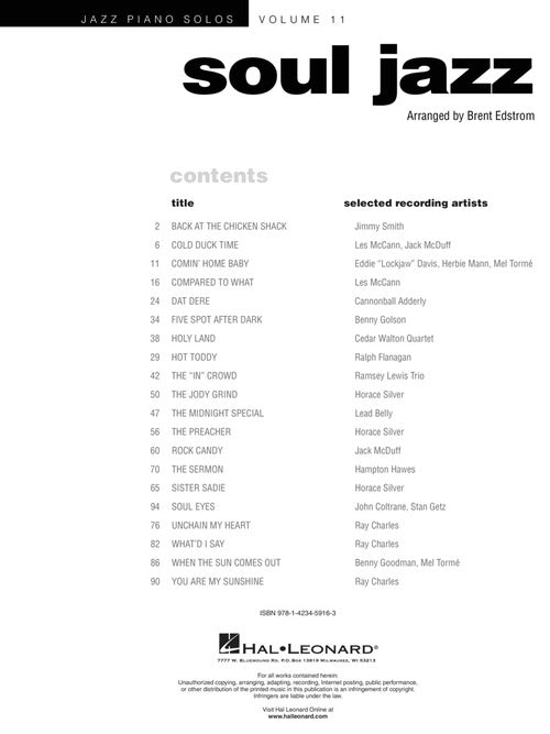 Composer: Various Soul Jazz Jazz Piano Solos Series Volume 11 Publisher: Hal Leonard Category: Keyboard & Piano/Vocal/Guitar Series: Jazz Piano Solos Format: Softcover Solo arrangements with chord names of 20 soulful tunes: Dat Dere · Hot...Regular price $23.99 -