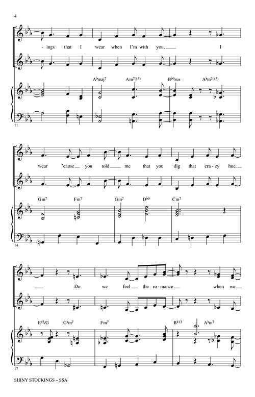 Shiny Stockings Octavo SSA Showcase your vocal jazz group with this accessible setting of the Ella Fitzgerald/Count Basie standard. Swing style, jazz harmonies, group scat and solo improvisation make this a great selection for developing style...Regular price $27.99 -