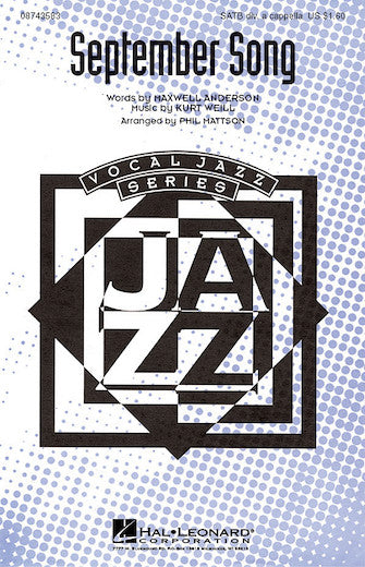September Song Composer: Kurt Weill (Kurt Weill/arr. Phil Mattson) Publisher: Category: Choral Series: Jazz Chorals Format: Voicing: SATB divisi a cappella This a cappella arrangement of the vocal jazz standard will leave your audience spellbound. Stunning!...Regular price $25.99 -